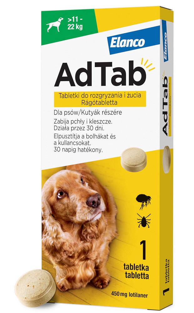 AdTab to mała, smaczna tabletka do rozgryzania i żucia dla psów o smaku mięsa, która szybko zwalcza kleszcze i pchły. Jest bezpieczna, skuteczna i zaczyna działać już po dwóch godzinach. Działanie AdTab utrzymuje się przez cały miesiąc. Ponieważ zaakceptowało go ponad 99% psów biorących udział w naszych badaniach1,2, możesz mieć pewność, że zawsze odpowiednio dbasz o swojego pupila.