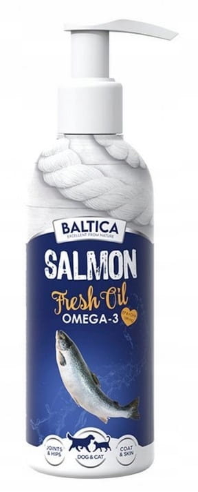 BALTICA EXCELLENT Suplements Salmon Fresh Oil to wysokiej jakości olej z łososia atlantyckiego w klasie SUPER PREMIUM, opracowany z myślą o codziennej suplementacji diety psów i kotów – także szczeniąt od 4. tygodnia życia. Stanowi naturalne źródło niezbędnych kwasów tłuszczowych Omega-3, w tym EPA i DHA, których organizm pupila nie jest w stanie samodzielnie wytwarzać.