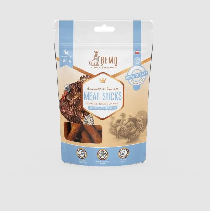 Bemo Meat Sticks to kabanosy wyprodukowane z indyka 100%. Jest to przekąska wysokobiałkowa i wysokoenergetyczna. Idealnie spisuje się jako nagroda dla pupila np. podczas treningu lub spaceru i jest uzupełnieniem diety.