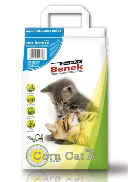 Żwirek Benek Super CORNCat cechuje wyjątkowa chłonność i szybka absorbcja płynów. Żwirek tworzy niewielkie płaskie bryłki. Dzięki tym cechom żwirku czyszczenie kuwety staje się wyjątkowo łatwe i wygodne. Żwirek skutecznie neutralizuje przykre zapachy, natomiast delikatna woń morskiej bryzy wprowadza przyjemne uczucie świeżości do pomieszczenia. Właściwości żwirku sprawiają, że ten nie rozsypuje się poza kuwetę.