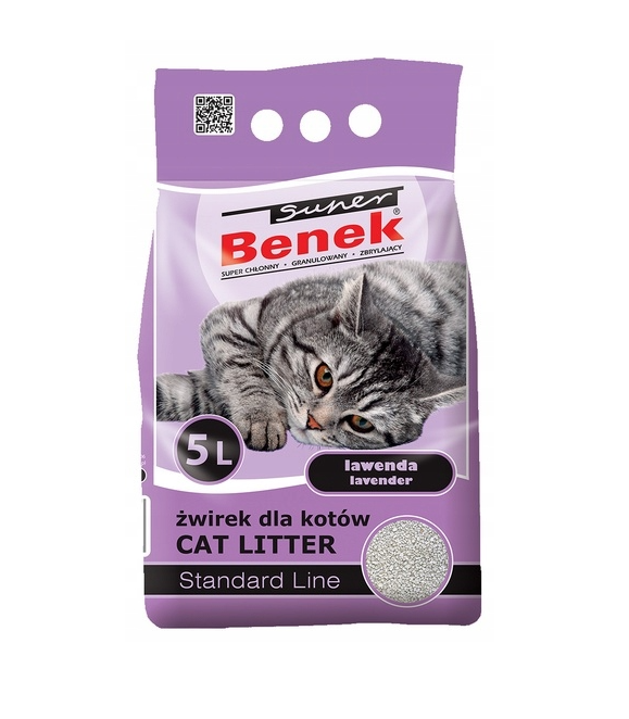 Super Benek Lawenda zapachowy to żwirek higieniczny dla kotów. Żwirek zawiera kompozycję lawendy o przyjemnym i uspokajającym zapachu. Olejki lawendy mają ponadto różnorakie zastosowanie min. działają aseptycznie, oraz likwidują napięcie nerwowe. Polecany dla zwierząt młodych, bardzo ruchliwych, często przebywających na zewnątrz. Posiada silne oddziaływanie przeciwgrzybiczne, oraz przeciwzapalne nie powodując żadnych ubocznych skutków.