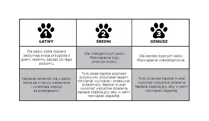 Będzie musiał węszyć i obracać poziomy łapami lub pyszczkiem - wtedy natrafi na kolejne wyzwanie: zdejmowanie kosteczek skrywających łakocie. Twój czworonóg szybko nauczy się odnajdywać ukryte skarby!