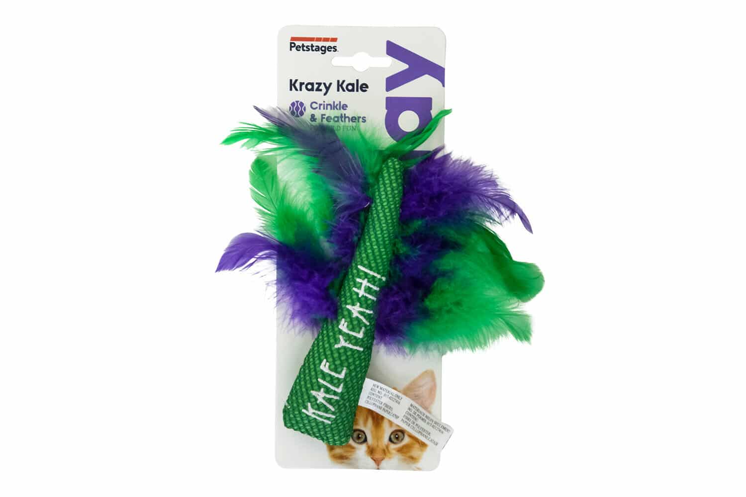 Krazy Kale to zabawka z materiałem siatkowym, który pomaga w czyszczeniu zębów kotka podczas żucia i delikatnymi zielono-fioletowymi piórkami, które kochają koty.