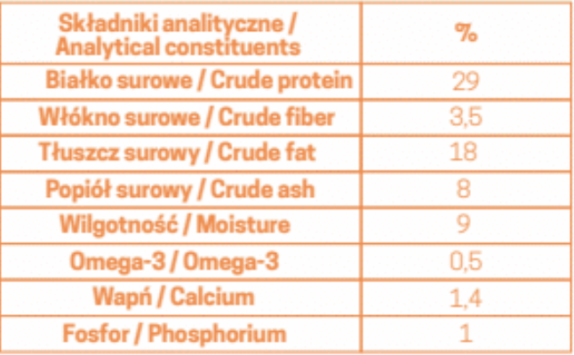 Dodatki dietetyczne / kg: witamina A (3a672a) 14.000 j.m.; witamina D3 (3a671) 1.000 j.m.; witamina E (3a700) 100 mg, tauryna (3a370) 1.000 mg, żelazo (3b103) 100 mg; cynk (3b605) 125 mg; miedź (3b405) 10 mg; mangan (3b503) 5 mg; jod (3b202) 1,5 mg; selen (3b801) 0,2 mg.