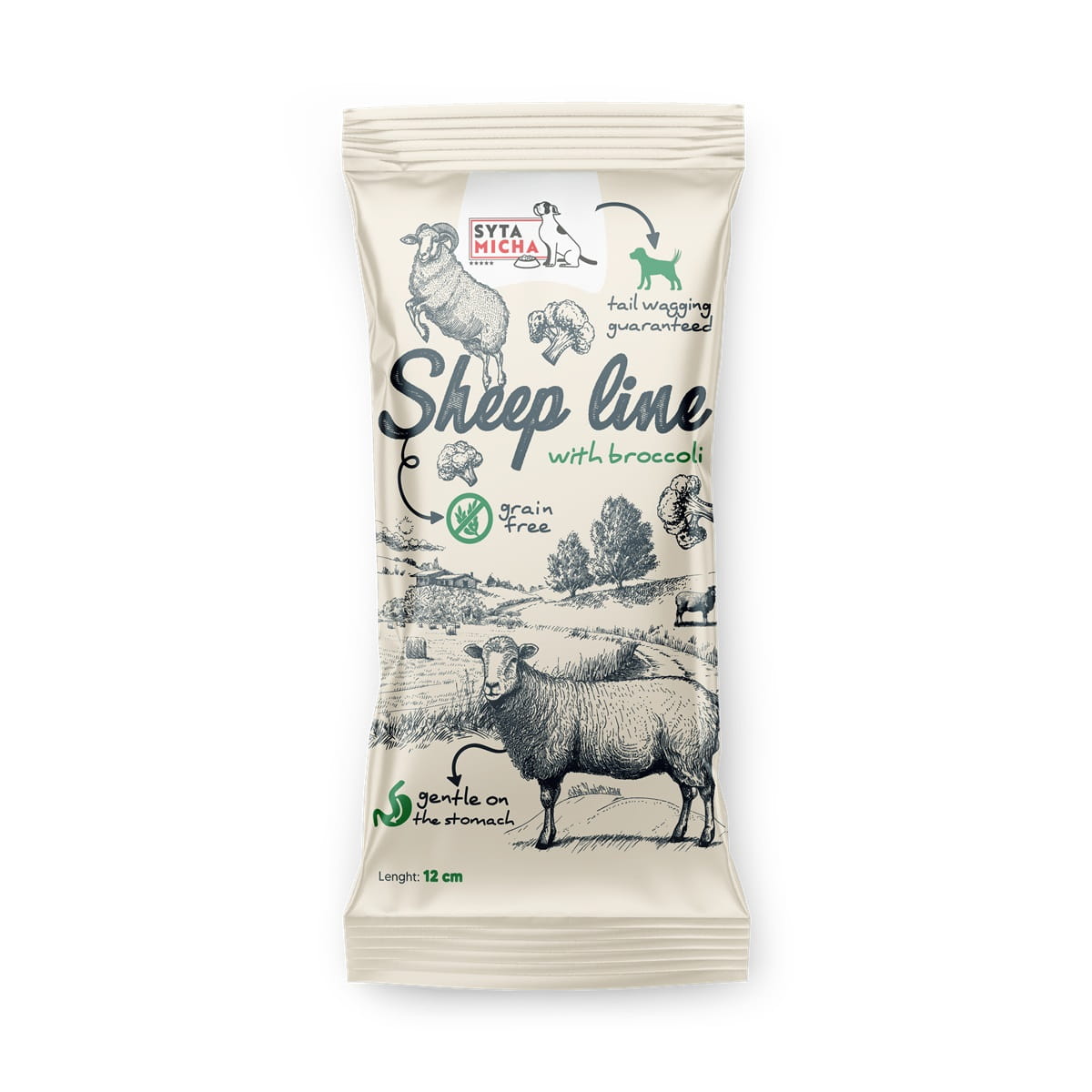 Kość do żucia „Owca z Brokułem” (Syta Micha) to wyjątkowy, w 100% naturalny gryzak łączący zdrowie z rozrywką. Powstała z hipoalergicznej skóry owczej i mięsa owczego, a jej receptura została wzbogacona o superfoods — brokuł, żurawinę i kurkumę.