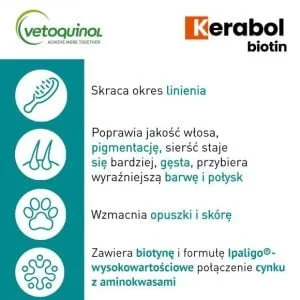 Kerabol biotin to karma uzupełniająca do stosowania przy nadmiernym wypadaniu, łamliwej, matowej i suchej sierści psów i kotów. Jej podawanie uzupełnia dietę czworonogów w składniki kluczowe dla wyglądu futra: