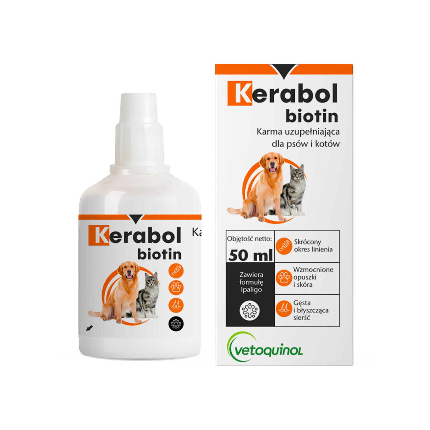 Kerabol biotin to karma uzupełniająca do stosowania przy nadmiernym wypadaniu, łamliwej, matowej i suchej sierści psów i kotów. Jej podawanie uzupełnia dietę czworonogów w składniki kluczowe dla wyglądu futra: