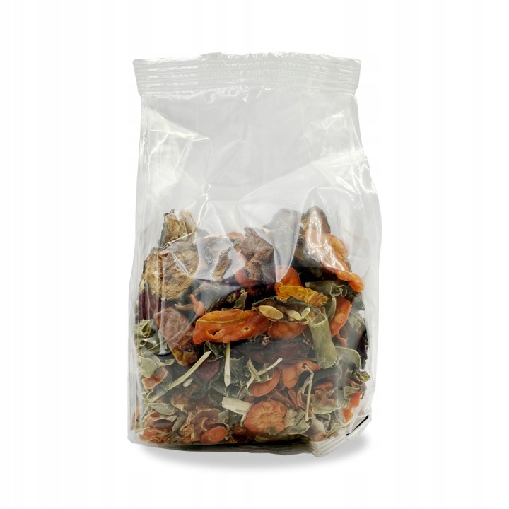 Udoskonalona receptura, oparta wyłącznie na naturalnych składnikach w postaci suszonych warzyw, bez dodatku produktów piekarniczych. Mieszanka uzupełniająca stanowi cenne źródło witamin, minerałów oraz pektyn, wspierając zdrowie i codzienną kondycję zwierzęcia.