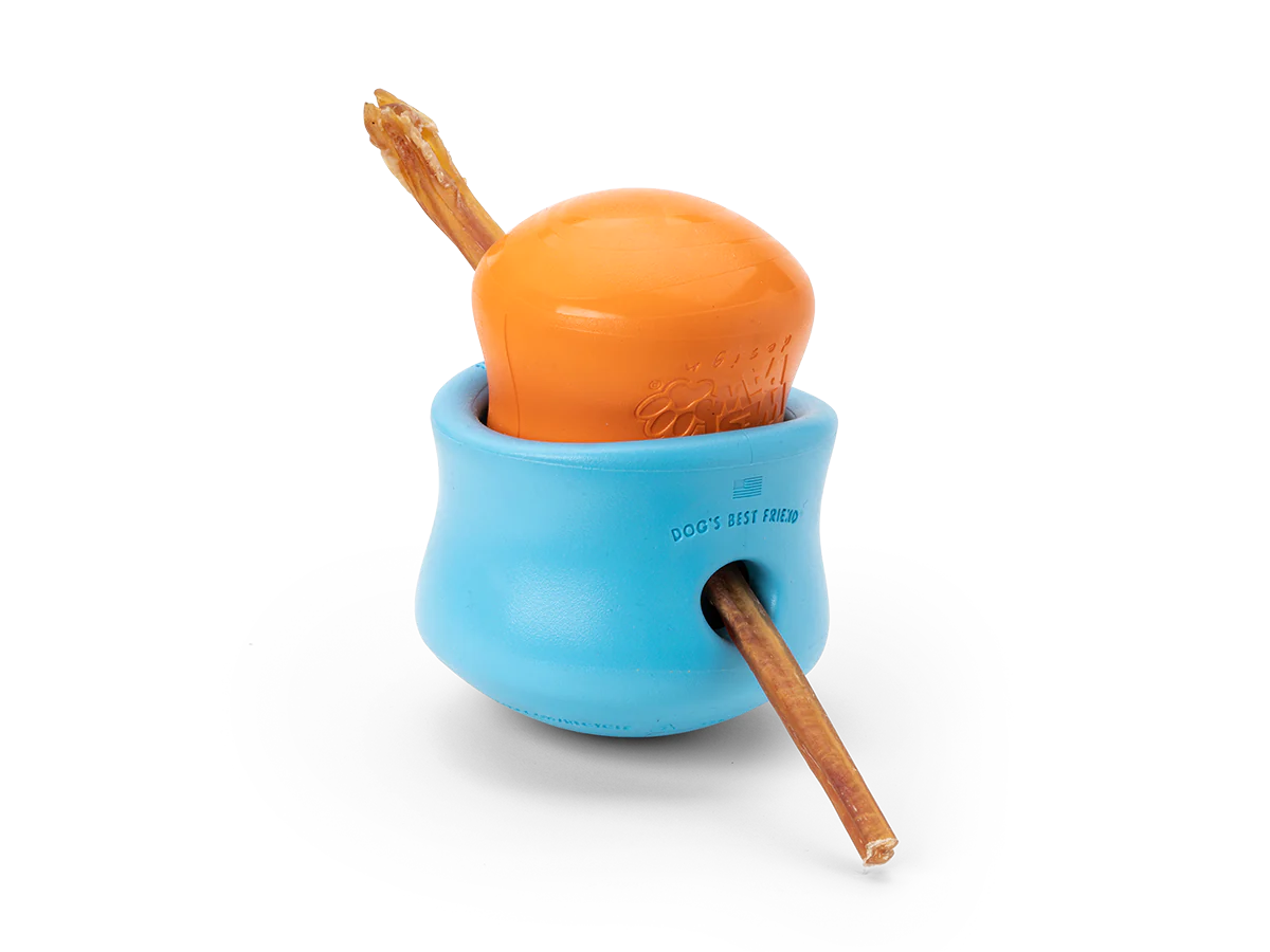Zabawka ma kształt kubeczka z zaokrąglonym spodem i wyposażona jest w specjalne wypustki, które utrzymują smakołyki wewnątrz, zachęcając psa do dłuższej i bardziej kreatywnej zabawy. Możesz używać jej pojedynczo lub połączyć z wersją Small (S), aby stworzyć dystrybutor suchych przysmaków.