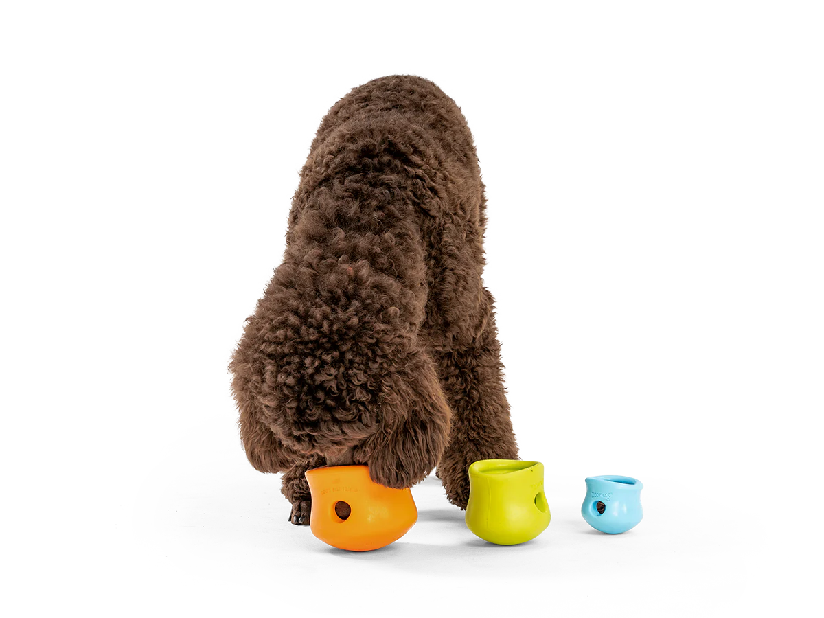 Zabawka ma kształt kubeczka o zaokrąglonym spodzie i wbudowane wypustki, które utrzymują smakołyki w środku, zachęcając psa do dłuższej i bardziej angażującej zabawy. Można jej używać pojedynczo lub połączyć rozmiar S z L, tworząc jeszcze ciekawszy dystrybutor suchych przysmaków.